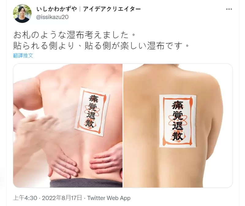 腰痠背痛时,你第一时间会採取的解法是什么?现代人爱用痠痛贴布,不管是落枕、姿势不良、长时间重複出力或者激烈运动导致的肢体痠痛,动不动就要贴一下,不过好像没几个人在乎过痠痛贴布的外观?岛国雅虎设计师兼艺术总监石川和也近日在上分享他的脑洞创意——「痛觉退散」符咒贴布。