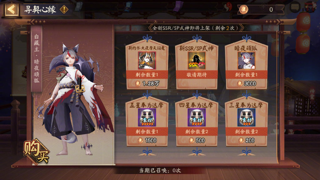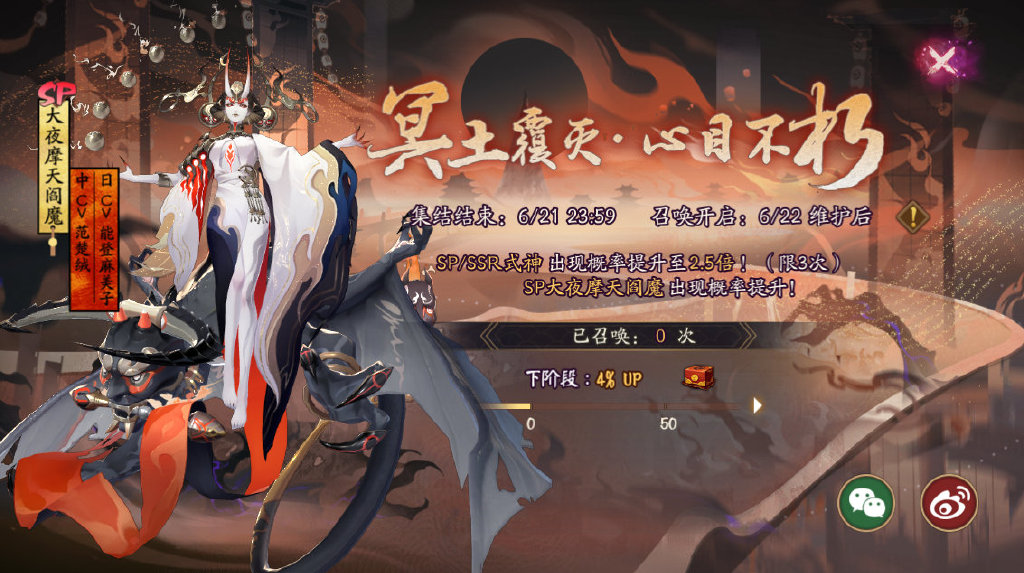 召唤期内使用神秘的符咒、勾玉、现世符咒进行召唤达到599次时,若仍未获得SP大夜摩天阎魔:对于6月22日维护前已达成SSR全集赏的大人们,第600次召唤必定获得SP大夜摩天阎魔,并额外获赠惊喜礼包一份。对于其他大人们,召唤满600次后,获得SP大夜摩天阎魔的概率将提升至25%。