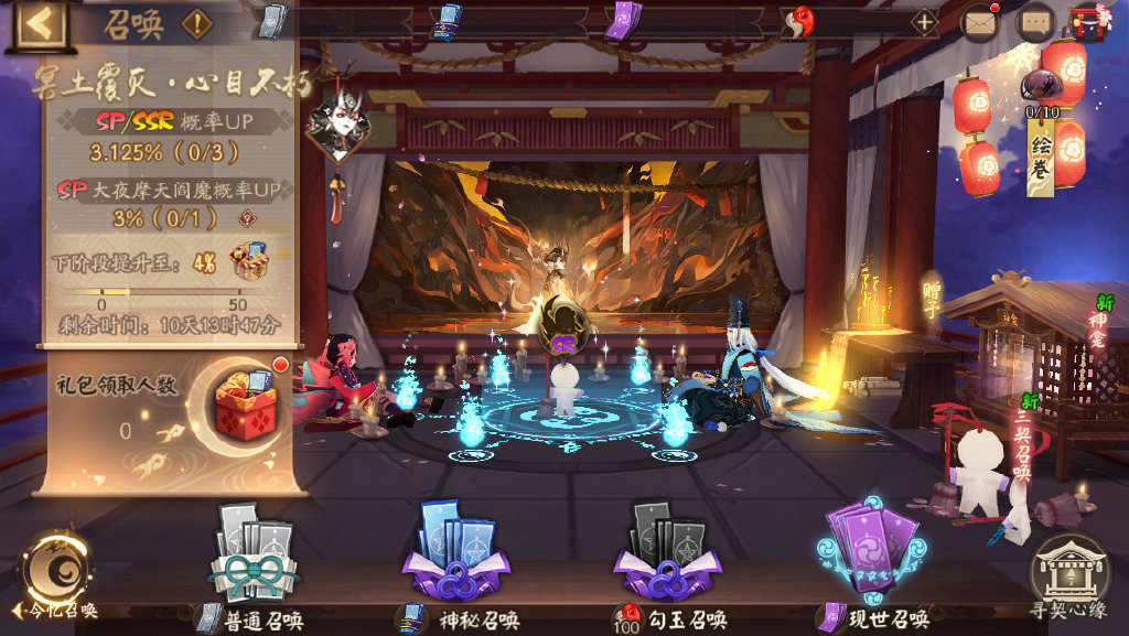 召唤期内使用神秘的符咒、勾玉、现世符咒进行召唤时,SP/SSR式神出现概率提升至原来的2.5倍!每位大人可享受3次SP/SSR概率UP的机会。